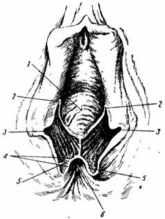 / — задня стінка вагіни, 1 — верхній край роз. риву; 3 — задня спайка; 4 — слизова прямої кишки; 5 — сфінктер; 6 — анус. |